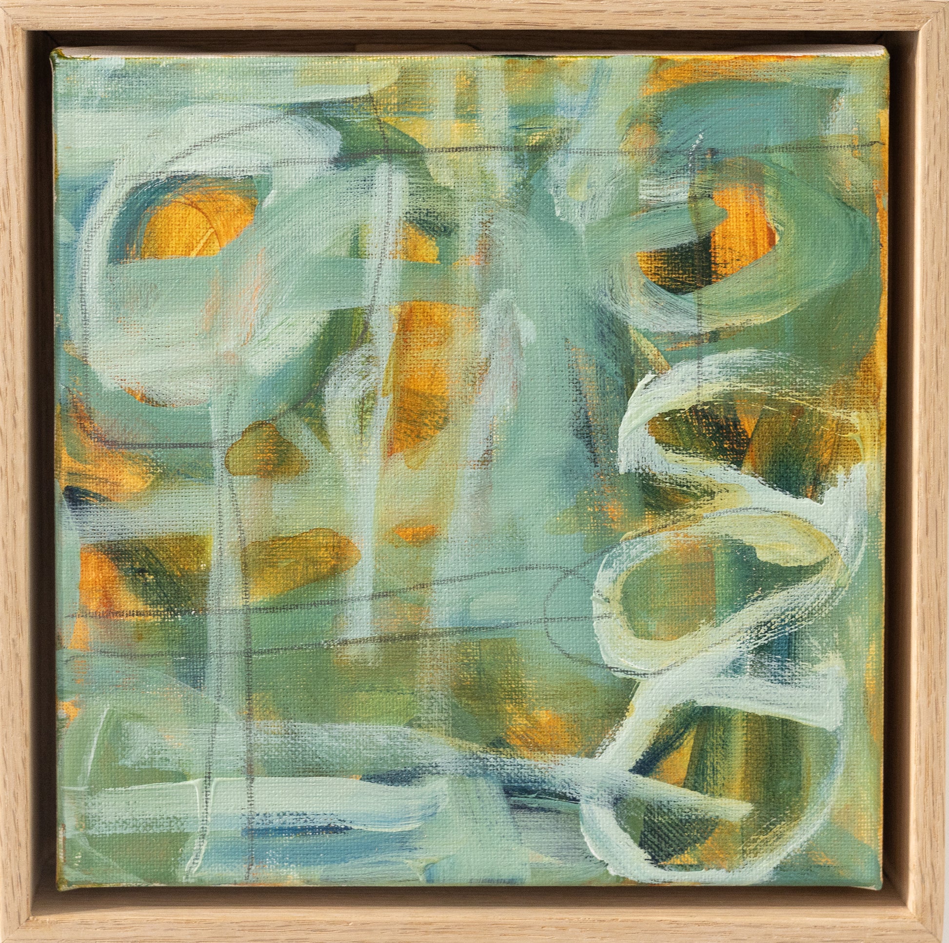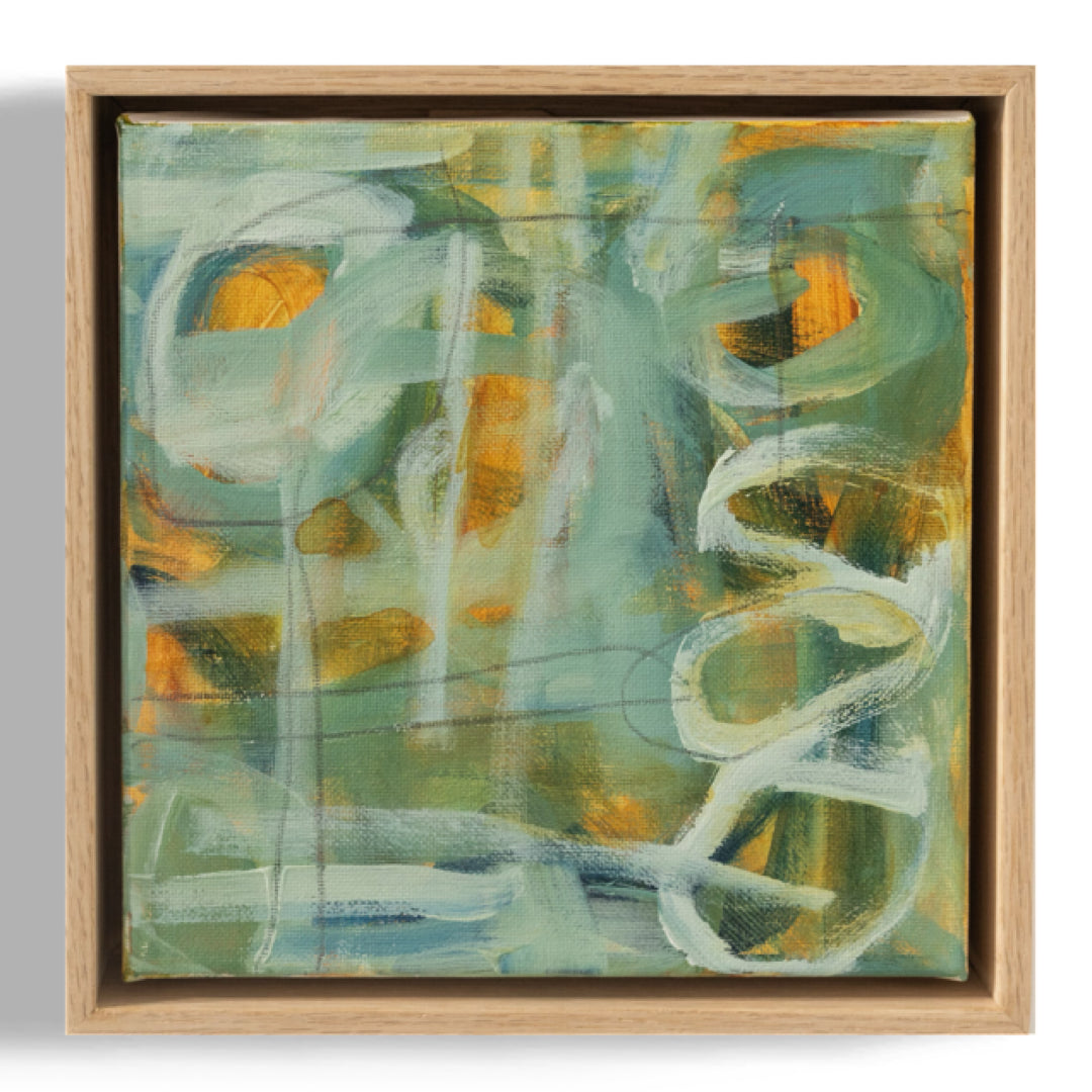 'Drift 1' (2024) is an original acrylic and mixed media painting on stretched canvas by Tamzin Rasmussen. The painting incudes a simple but elegant float frame made from American Oak