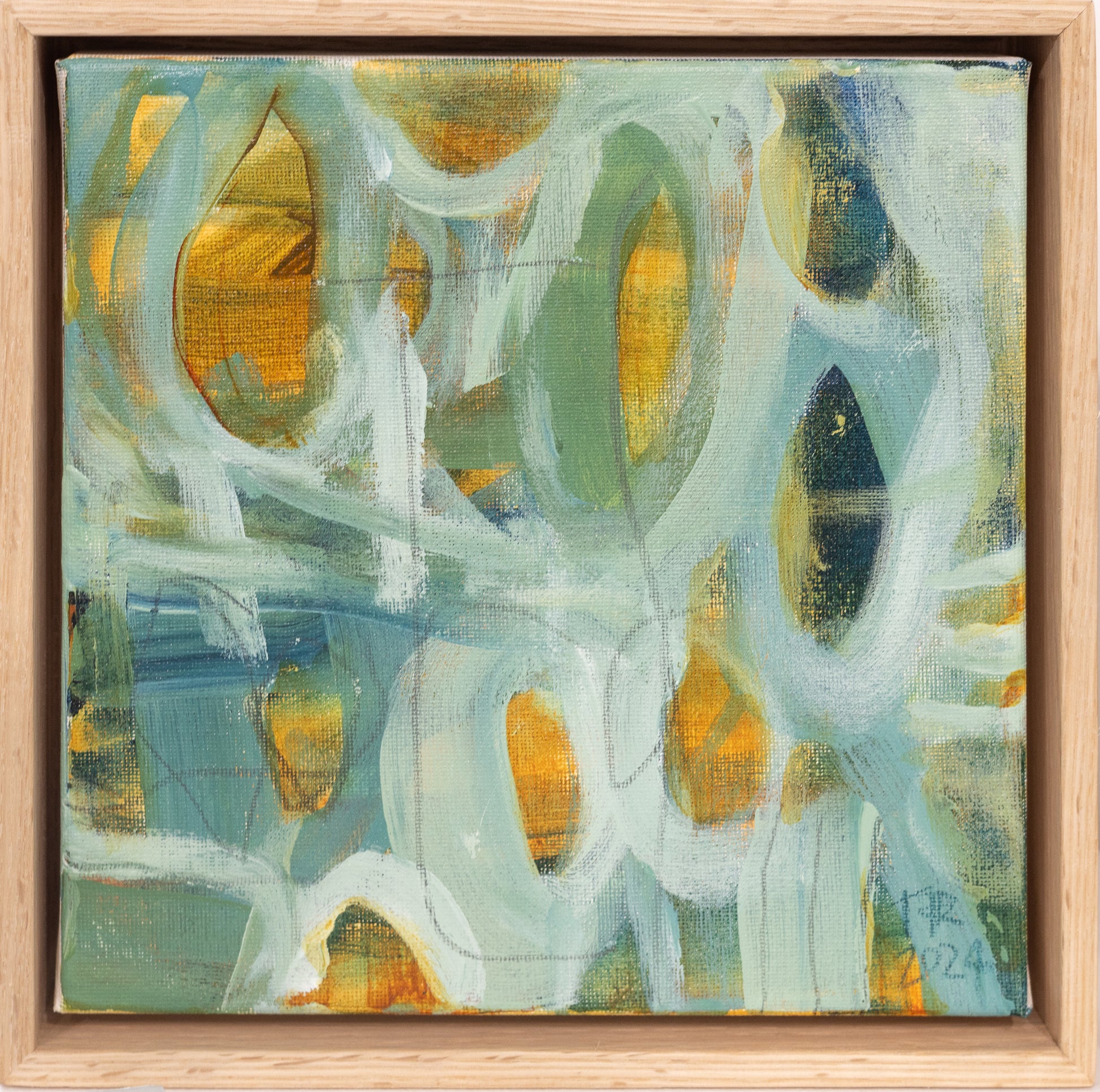'Drift 2' (2024) -SOLD- is an original acrylic and mixed media painting on stretched canvas by Tamzin Rasmussen. The painting incudes a simple but elegant float frame made from American Oak