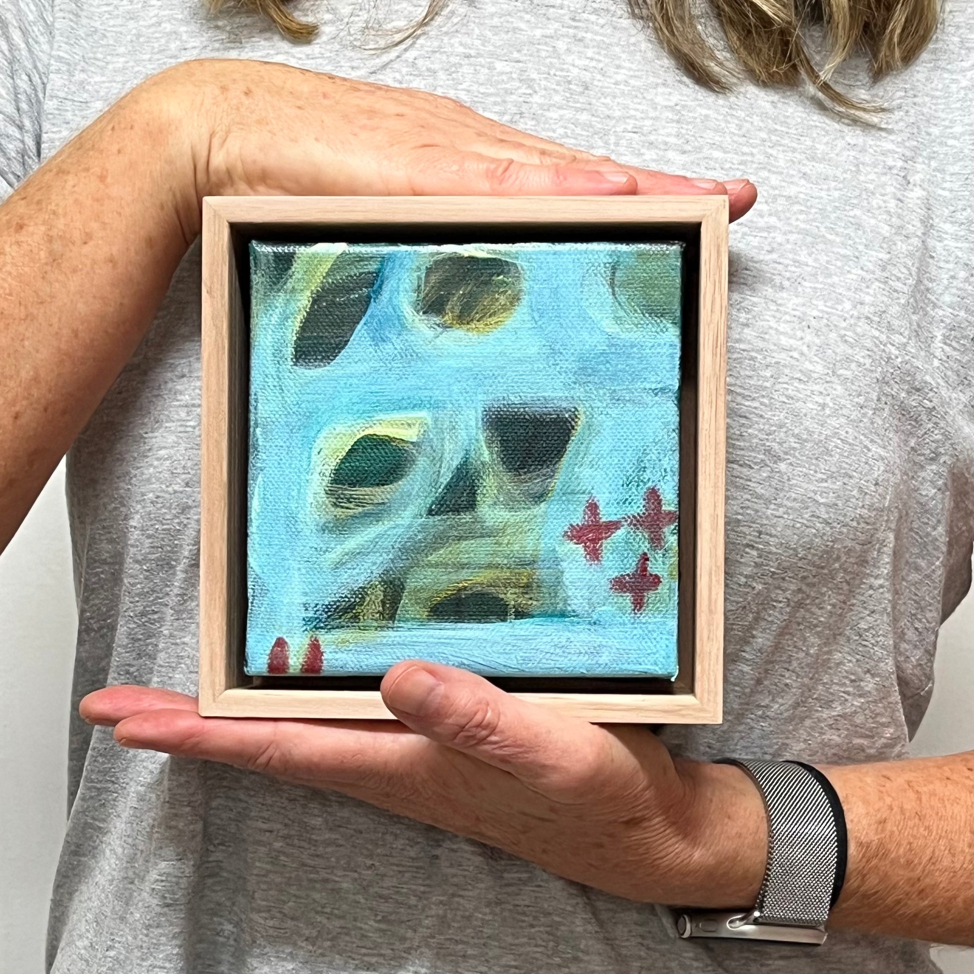 H 12.5cm x W 12.5cm x D 3.8cm, float framed in oak and ready to hang.