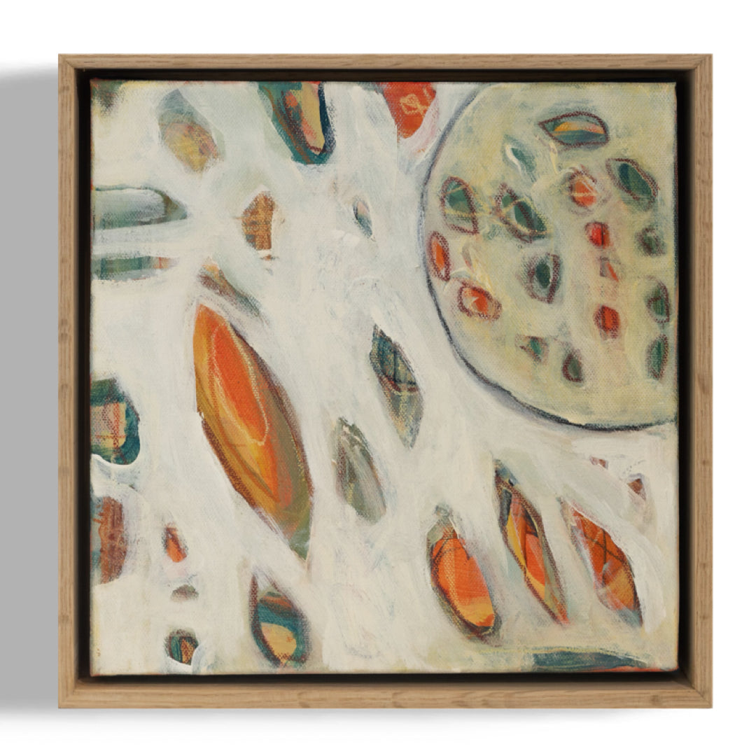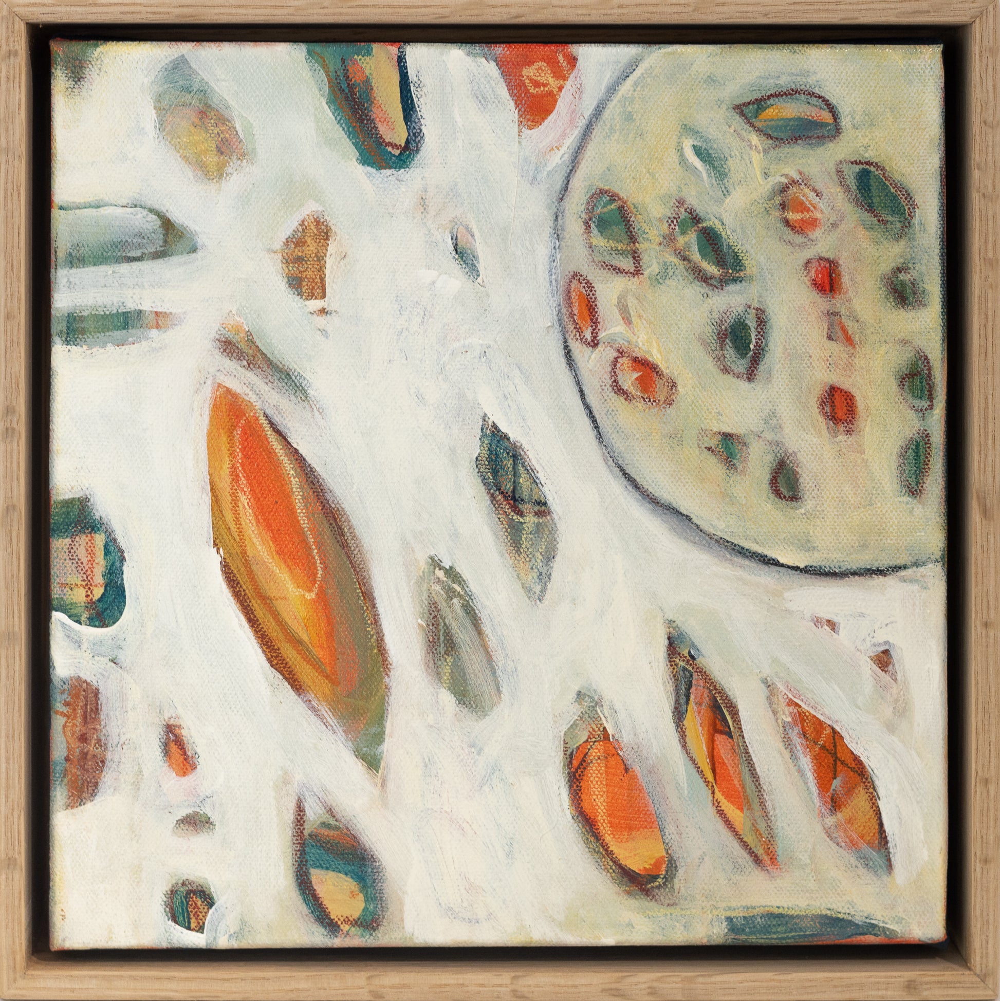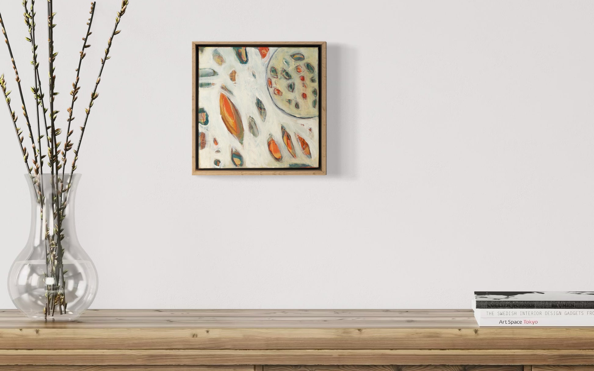 'Shoreline 2' (2023) is an original acrylic and mixed media painting on stretched canvas by Tamzin Rasmussen. The painting incudes a simple but elegant float frame made from American Oak