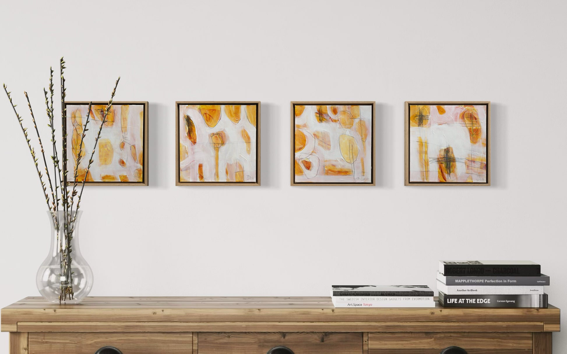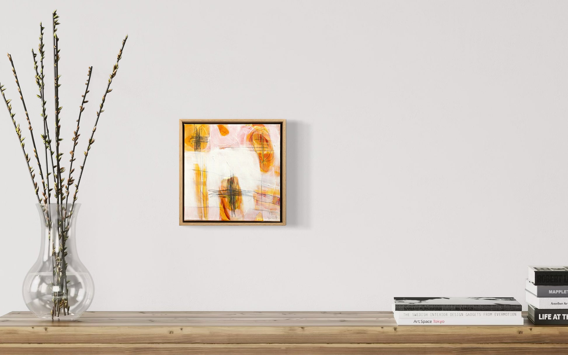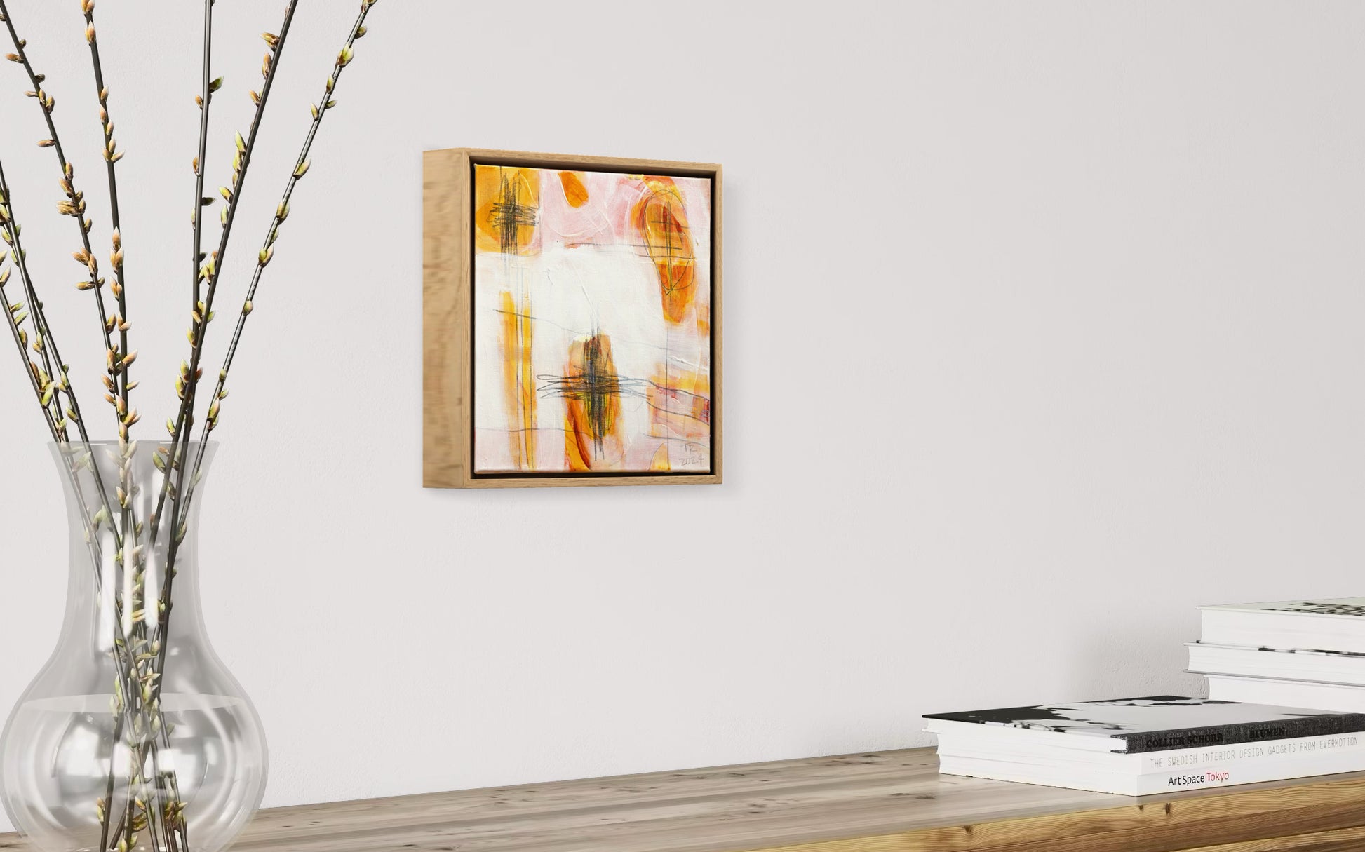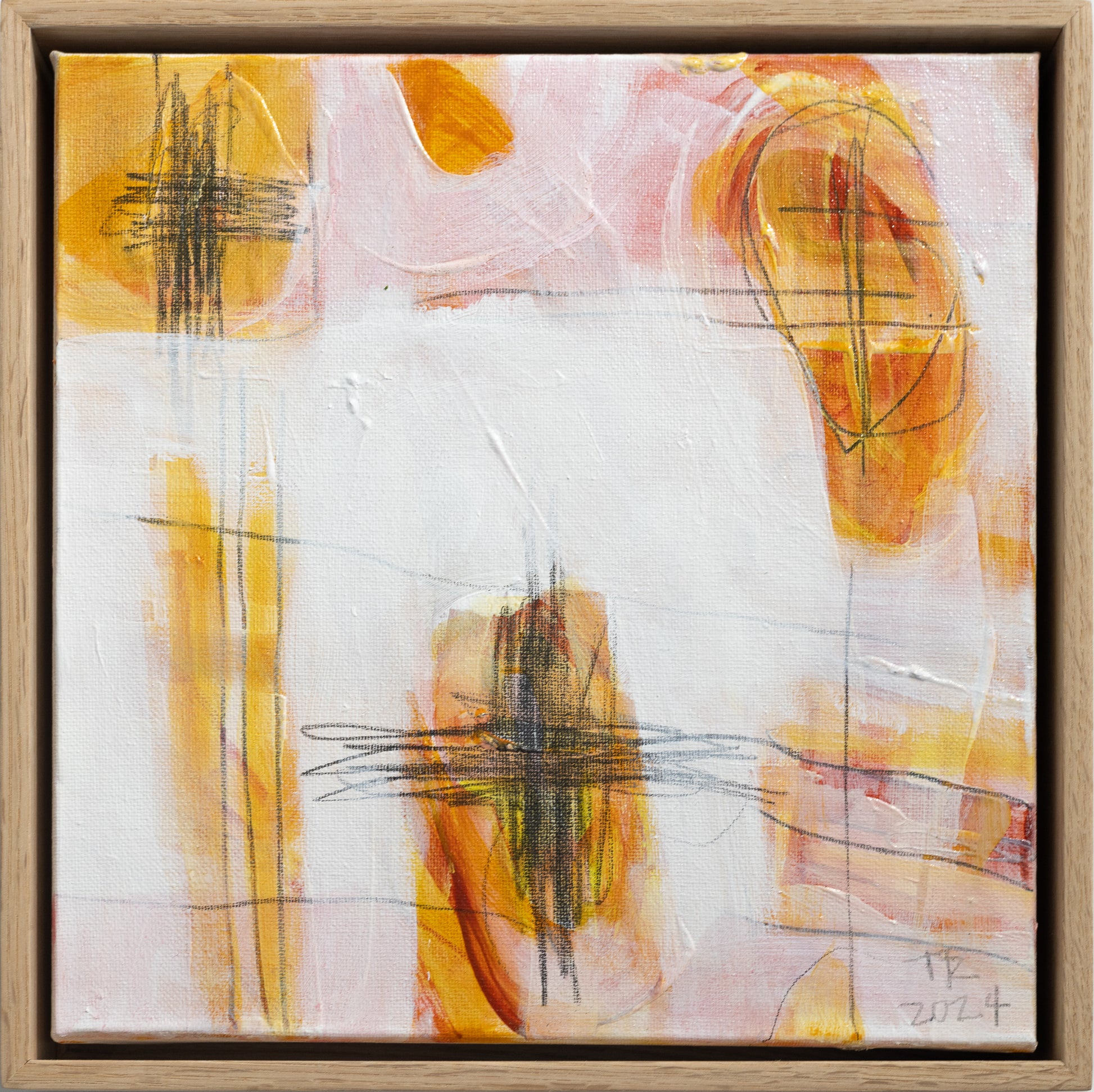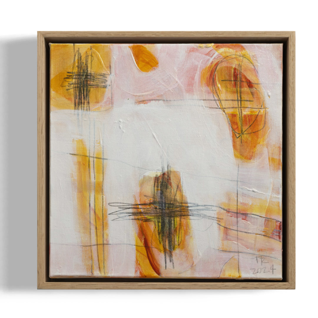 'Touch 2' (2024) is an original acrylic and mixed media painting on stretched canvas by Tamzin Rasmussen. The painting incudes a simple but elegant float frame made from American Oak