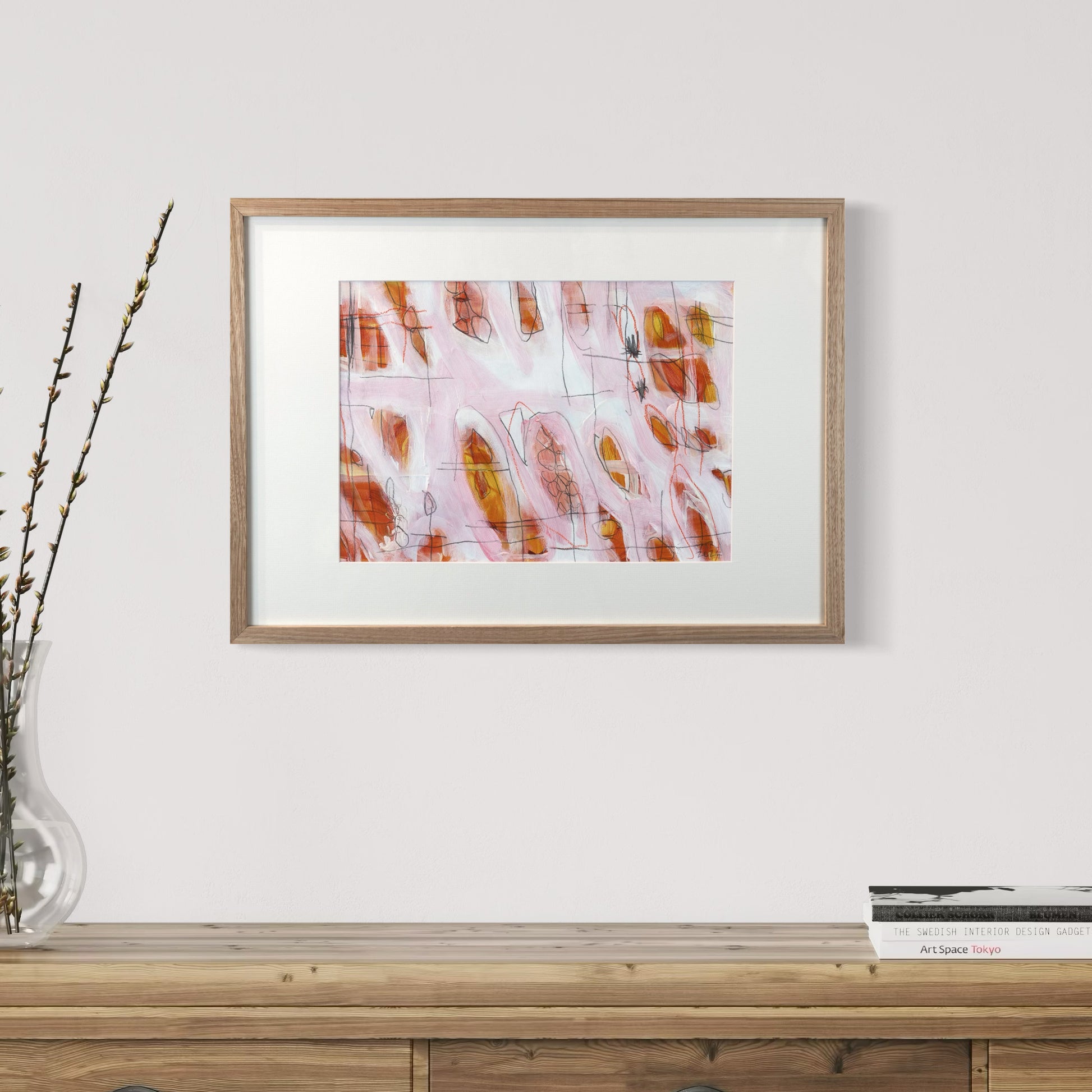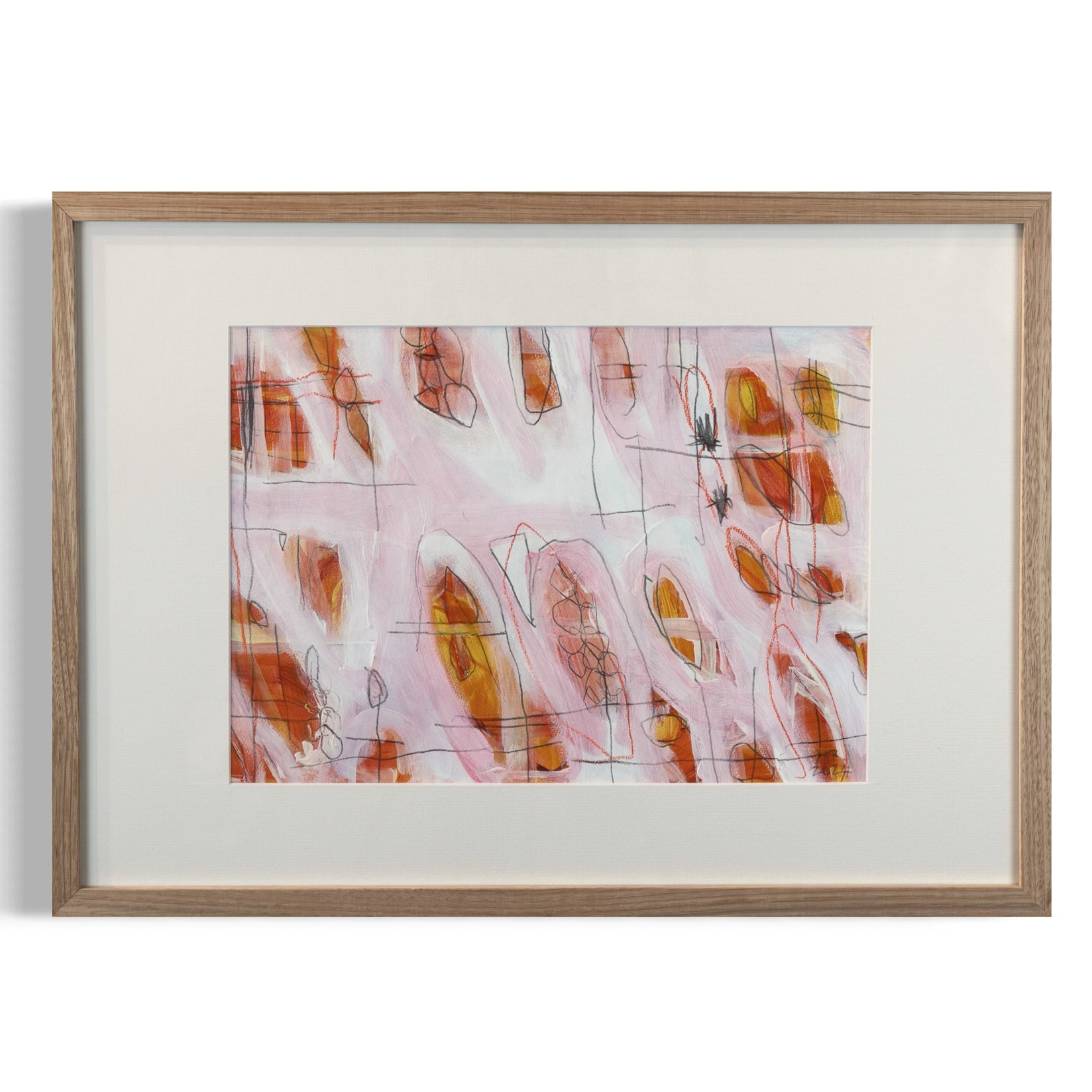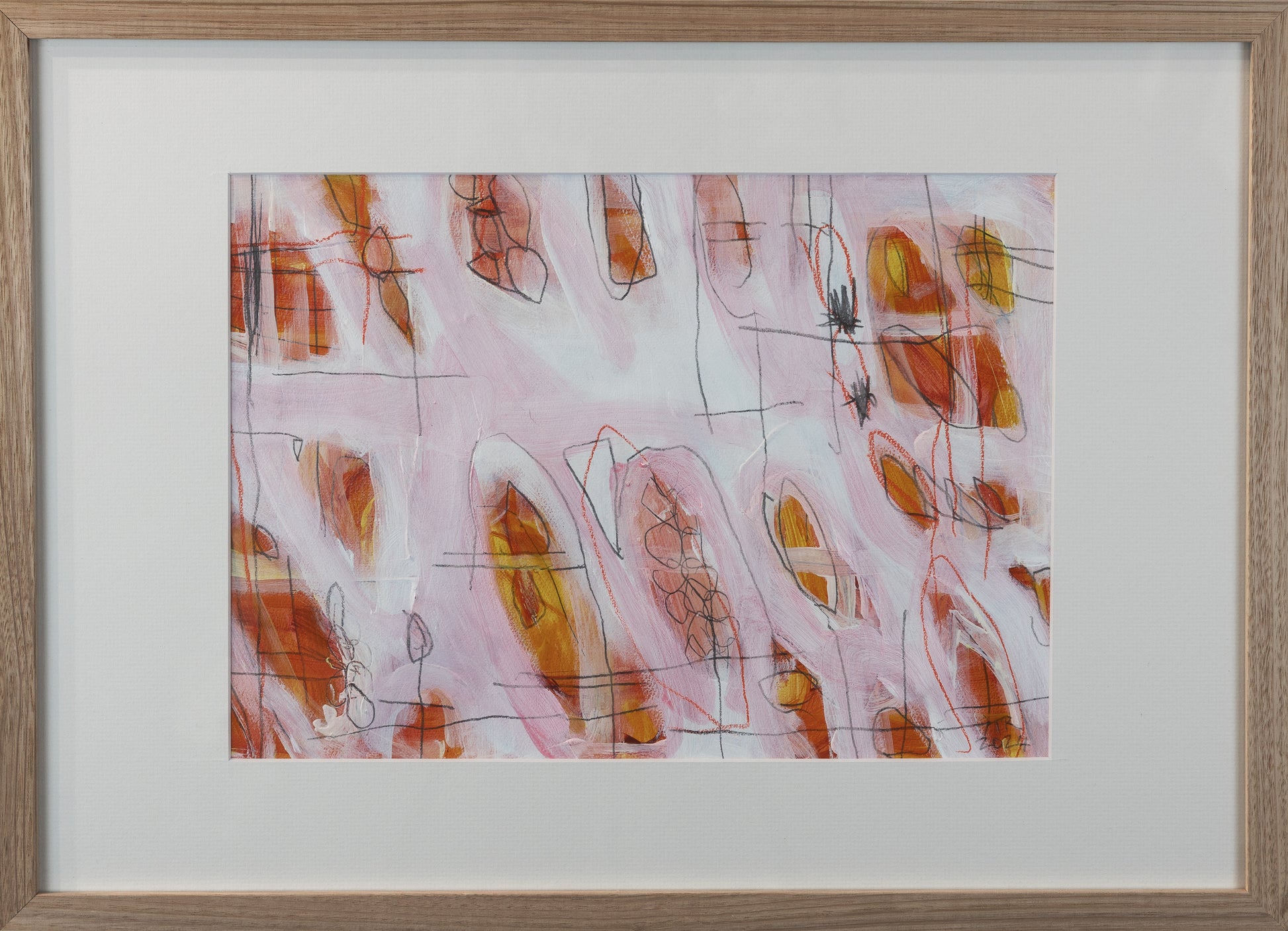 'Unfolding 1' (2024) is an original acrylic and mixed media painting on 300gsm archival paper by Tamzin Rasmussen. It is framed under glass with an attractive Victorian Ash frame and white mount.
